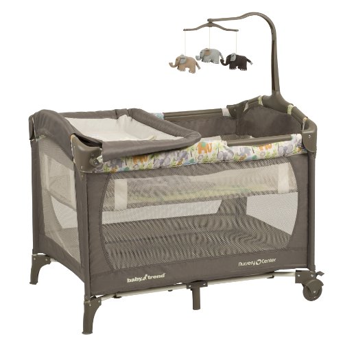 This Baby Trend Nursery Center is the perfect multi-functional unit for parents that need a nap area, changin area or play area. Portable and easy to keep clean, this unit is a must have for parents because it is easy to travel with as well. This design features Amazon, an elephant themed neutral print accented with orange and some green. Features include a removable bassinet, mobile with three plush toys, fip away changing table and a larget travel/storage bag. For safety and mobility, this nursery center comes equipped with a one hand locking mechanism and large wheels with breaks. Playard: Birth ~ 30 lbs or 35"